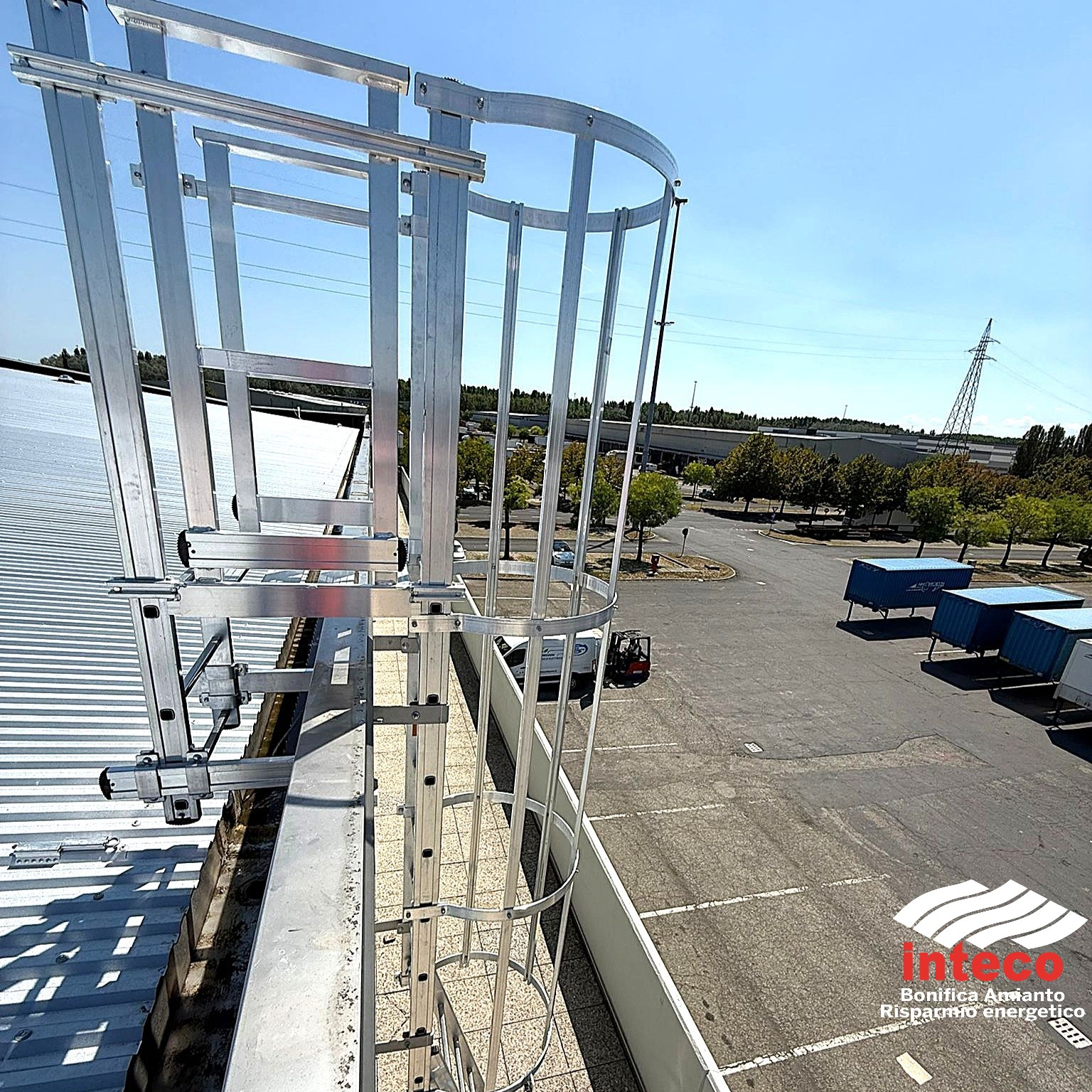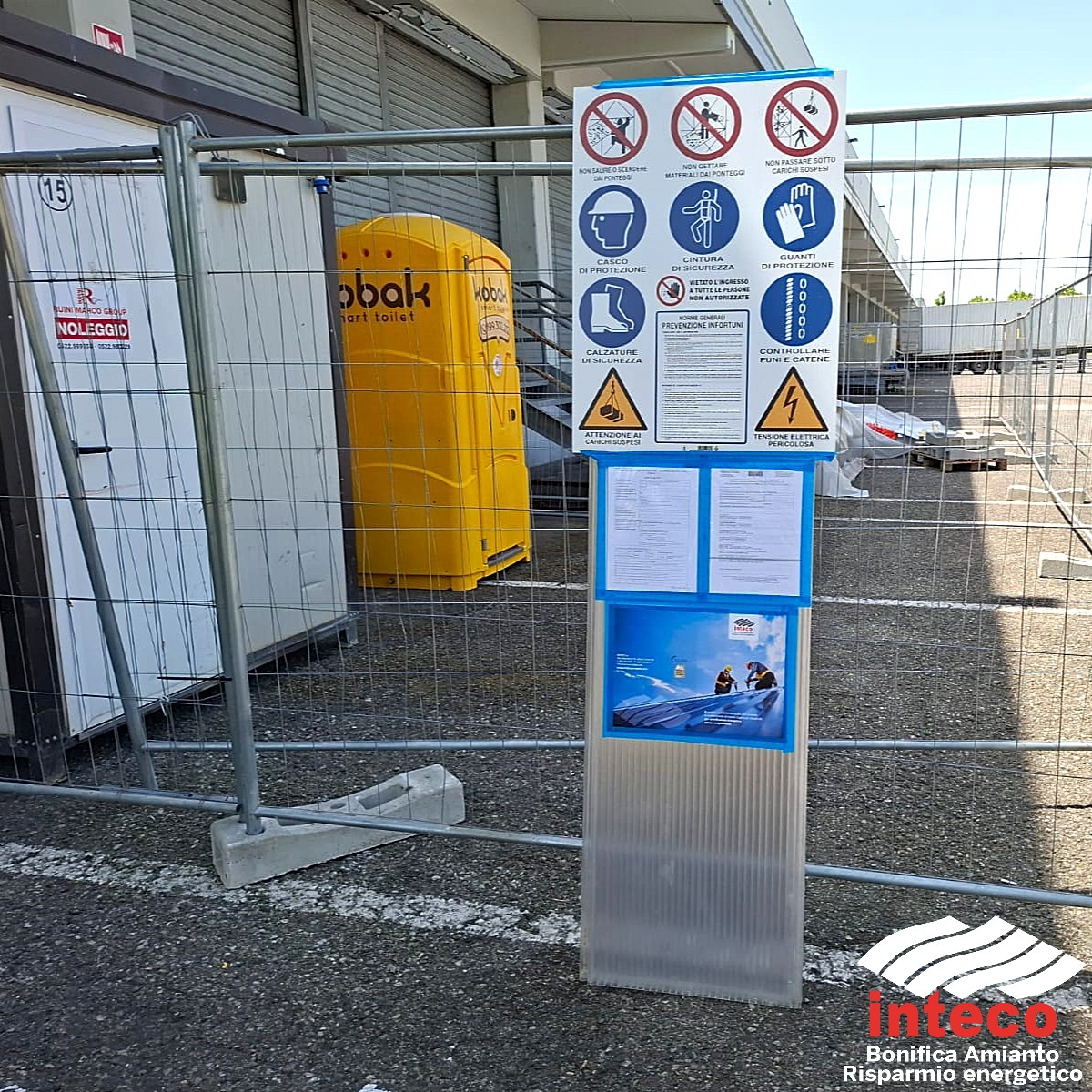 Reti anticaduta sotto i lucernai, parapetti perimetrali, ponteggio di risalita e, naturalmente, la cabina di decontaminazione per gli operatori.
